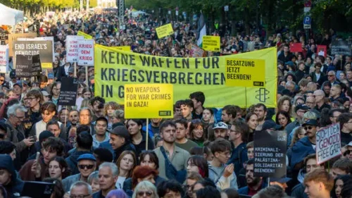 Unter dem Titel „All Eyes on Gaza – Stoppt den Genozid!“ versammelten sich 100.000 Teilnehmer*innen aus ganz Deutschland, um für ein Ende des Krieges in Gaza, für den Stopp deutscher Waffenlieferungen nach Israel und für einen ungehinderten Zugang humanitärer Hilfe für die Menschen im Gazastreifen zu protestieren.